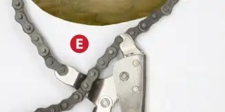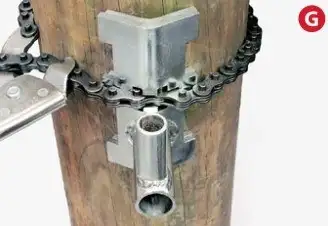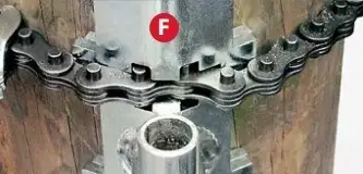 E - Loosen the adjusting screw on the back handle of one set of grips to about halfway out. Starting with the lower guide, pass the chain around the post and attach the loose end to the grip jaw. Leave enough space to place the guide inside the chain against the post.